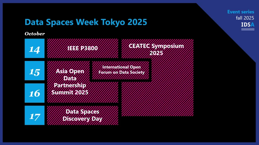 - The 3rd Data Spaces Discovery Day Tokyo will happen on October 17. With the Data Spaces Discovery Day, the week will finish with its hottest highlight, building on the success of the first two editions in 2023 and 2024. IDSA’s CEO Lars Nagel, IDSA board member Akira Sakaino from NTT DATA and Christoph Mertens will present the latest achievements and report on new data spaces sussess stories.
